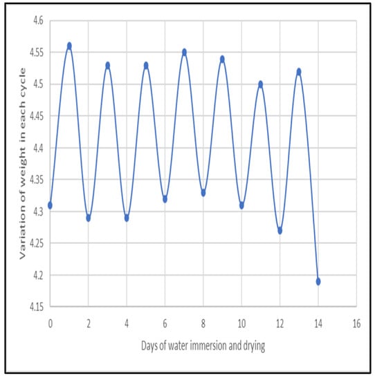 The water absorption capacity of the SRMBs was performed as in Figure 13. A minimum of five specimens were immersed in water, and the average weight difference was calculated as the percentage of water absorption. The average percentage water absorption value of the optimized mix after 28 days and 90 days was less than 6%, represented in Figure 14. Thus, the bricks can be considered heavy-duty bricks as per IS 2180:1988 [49]. The water absorption for the SRMBs after 28 days and 90 days of curing was measured and the results are presented in Figure 14. From the results, it is obvious that the SRMBs had good durability and were considered to be suitable for heavy duty applications as the percentage of water absorption was much less than the prescribed value (10%) as per clause 6.2 of IS 2180:1988 [49].