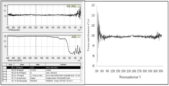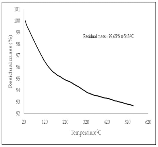 The XRD pattern in Figure 24 shows that the structure of the SRMBs are amorphous. The position of 02θ was from 5.47 to 33.71. Calcium europium manganese oxide and aluminium phosphate hydrate were given a pattern list score in the analysis. The wide hump clearly shows that the mineral phases were completely dissolved in the binding solution forming the geopolymerisation. The mass residue of the SRMBs was measured using TGA and the solid mass residue at 548 °C was 92.65%, i.e., it tended to have less loss in the SRMBs even at high temperatures. Thus, the thermal stability of the SRMBs was very high. The volatile components present in the SRMBs showed a small weight change even at a high temperature of more than 500 °C as shown in Figure 25. Figure 26 shows the graphical representation of the FTIR spectroscopy results, where the x-axis shows the intensity of the infrared spectrum and the y-axis represents the analysed material transmitted, i.e., the infrared light absorbed [50]. There were no peaks between 4000 and 750 cm−1, showing that there were no aromatic structures. A sharp peak was determined between 750 and 400 cm−1. As the peaks were very small, small organic materials may present in the material.