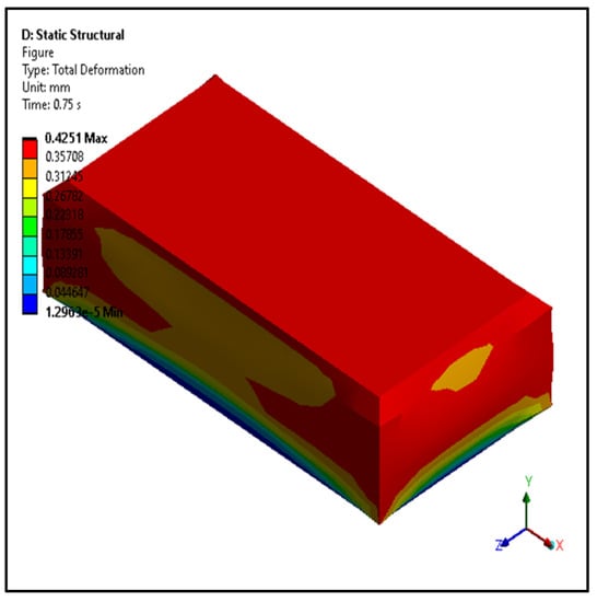 The load was applied to the SRMB differently in both the horizontal and vertical axes around the boundary condition for all possible failures. A uniform load was applied from the free end of the brick. The model and the total deformation of the SRMB is represented in Figure 27, Figure 28, Figure 29, Figure 30, Figure 31 and Figure 32. The load that was experimentally applied to the SRMB deviated 0.2 MPa in its equivalent stress and 0.025 mm in total deformation from the elemental analysis in the horizontal axis. The equivalent stress was 0.98 MPa and total deformation was 0.028 mm in the vertical axis deviation from the elemental analysis to practical evaluation. The following Figures illustrates the model, total deformation and stress–strain distribution of the SRMB when a load was applied in the horizontal and vertical axes.