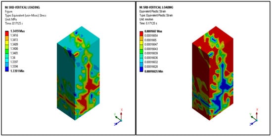 The stress distribution of the SRMB acted on the midpoint of the brick. The Von mises stress is given in the Figure below. As the brick is brittle, the plastic strain distribution was gradually applied until failure. The stress–strain distribution for the horizontal and vertical load brick is graphically represented in Figure 33. The graph illustrates that the load was gradually applied and failed at the peak point, as shown in the chart. The material properties of the SRMB in both the horizontal and vertical axes are given in Table 15.