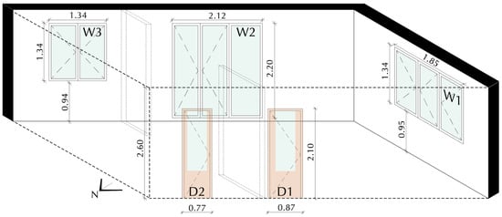 Isometric representation of the five openings of the room. The panels in two interior wooden doors are divided into two parts: The first is glazed with wooden mullions, and the lower part is only made of wood. The main door (D1) is 1.72 m², and the secondary door (D2) is 1.61 m². The southwest façade has a tilt-and-turn window (W1) (2.47 m²), the southeast façade has a door window (W2) with an area of 4.66 m², and a tilt-and-turn window (W3) with an area of 1.79 m². All windows are made of aluminium, double-clear glass of 3 mm each, and an air cavity of 13 mm. See Figure 3 for the plan view.
