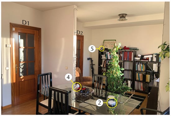 The in situ monitoring system consisted of two types of sensors: DELTA (model OHM HD37VBTV.1) and EXTECH (model CO210). Besides the two CO DELTA sensors (ppm) installed in the living room, three CO EXTECH sensors (ppm) were also implemented, in order to verify the homogeneity of the injected gas (see Figure 3 and Figure 4). Both had the same accuracy of ± 50 ppm, but the DELTA sensors were connected to the HOBO management system of the room, making it easier to manage and download their data.