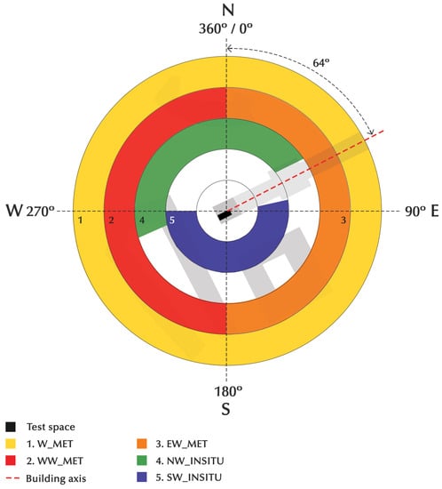 This preliminary study aims to reduce the uncertainty of infiltration in the building energy model calibration, using only the EnergyPlus infiltration objects and different wind data. Although many studies evaluate wind-driven infiltration modelling, as far as the authors know, none of the published validation reports on air leakage empirically compare different wind data applied with the EnergyPlus infiltration models, with one of the wind data being measured in situ. In this study, we revealed the use of the wind data from the weather file (hereafter, the global wind) against four other wind data to estimate the infiltration of a test room in an apartment in Spain. The global wind is usually applied in energy simulations. There is a general consensus that EP only accounts for wind speed and does not have a wind direction component in the infiltration objects []. Therefore, we focused on the global wind and disaggregated it into two types of data: the eastbound wind and the westbound wind. In addition, we used the wind data recorded with sensors in situ: one on the southeast façade and the other on the northwest façade. We applied the five wind data to the three infiltration models of EnergyPlus, resulting in fifteen combinations, to verify which of these most accurately represented the infiltration of the test space.