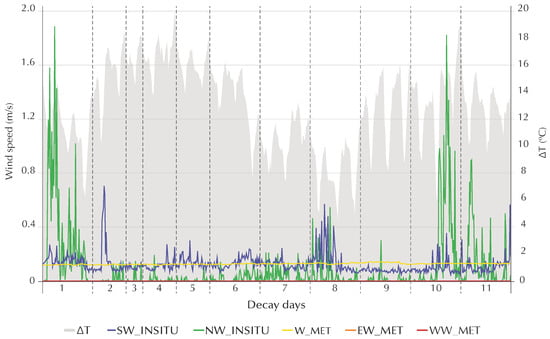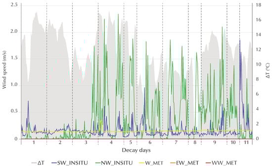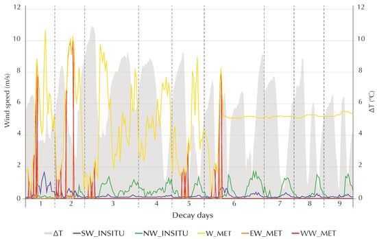 Graphical representation of selected wind speed data. W_MET is the weather station winds (herein as global wind) from 0° to 360°; WW_MET and EW_MET are the weather station west and east winds from 181° to 360° and 0° to 180°, respectively; NW_INSITU is the wind data recorded by the wind speed sensor on the northwest terrace; SW_INSITU is the wind data collected on the southeast terrace.