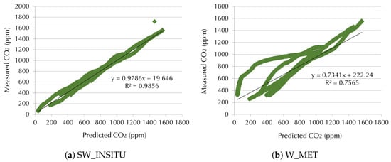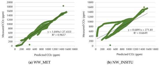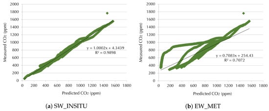 On the other hand, W_MET, EW_MET, and NW_INSITU do not approve the standard requirements in P_1_T with any air leakage object, presenting values of R² from 23% to 29%, worse than SW_INSITU in the same period. As aforementioned, these wind data are also the most inaccurate ones. The data variability of P_1_T requires the right wind data to produce high-quality models. Dispersion graphs in Figure 9 show the good and the bad correlation between the predicted and measured CO concentration in the first period provided by DFR using SW_INSITU and EW_MET, respectively.