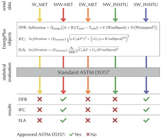 All results are presented in Table 5, followed by analysis and dispersion graphs, to facilitate a comparison between the three EnergyPlus models and the five wind inputs. As mentioned before, they were evaluated according to the criteria of the ASTM D5157 Standard, which requires compliance in all periods.