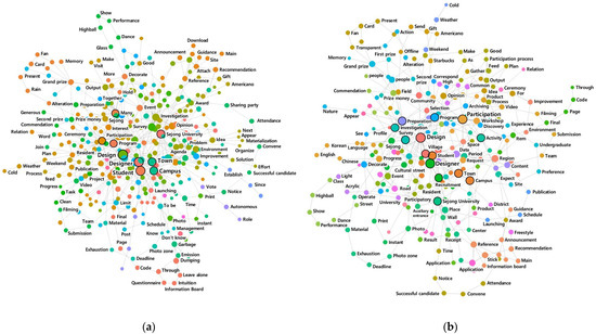 Figure 1a is the visualization effect of the network analysis for the whole content. The centrality of the words ‘design’, ‘designer’, ‘campus’, ‘town’, ‘student’, and ‘university’ is significant. Looking at the connected words by groups, the contents include holding awards and events, discovering local agendas, problem-solving processes, surveys, and the participation of residents. The facilitators inform the operation process of the project, and the students’ activities appear in a specific group; however, the activities of the residents do not appear.