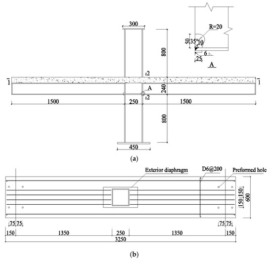 Figure 3 depicts the details of the RT connection composed of the CFUS beam and the CFSST column. In this connection, the longitudinal rebars in the beam are passed through the column through the holes drilled on the face of the tube wall, and there is no upper internal diaphragm in the tube. The connection details between the U-shaped steel beam and the steel tube wall are the same as those of the RS connection described above.