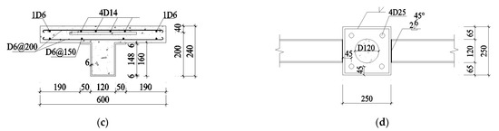 Figure 2 depicts the details of the RS connection composed of the CFUS beam and the CFSST column. In this type of connection, there are two internal diaphragms welded to the inside of the steel tube—one of them corresponding to the bottom plate of the U-shaped steel beam location, and the other one corresponding to the position of the longitudinal rebars in the beam. The bottom plate of the U-shaped beam is welded directly to the steel tube wall by a full penetration weld. The webs and the extending flanges of the U-shaped beam are attached to the wall of the steel tube by double fillet welds. The longitudinal rebars in the beam are cut off and connected to the column by sleeves that are welded to the tube wall. In order to ensure the quality of concrete pouring in the connection, the pouring holes and the vent holes should be provided in the upper and lower diaphragms. Moreover, the cope holes should be provided in the bottom plate of the U-shaped steel beam to ensure the quality of welding.