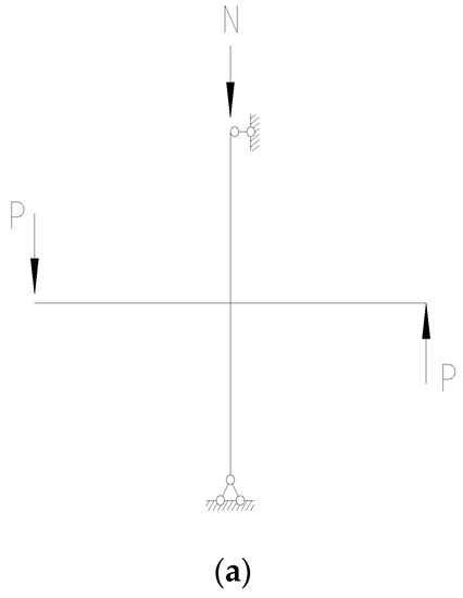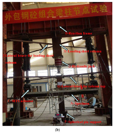 Figure 6a shows a schematic of the test setup. Axial loads were applied to the top of the column to simulate gravity loading. The two ends of the beam were subjected to equal and opposite vertical cyclic loads to simulate the seismic loading. The method of loading cycle was determined in accordance with the requirements of JGJ 101–96 [19]. The column’s bottom end was fastened to the spherical pin support connected with the ground, which was allowed to rotate in the plane of loading but was constrained from movement. The crossing braces were provided at the top of the column to prevent lateral moving of the column. Meanwhile, the pin joints were used at the connection between the braces and the column wall to allow the top end of the column to rotate. The vertical axial load was applied using a hydraulic jack with 2000 kN capacity. The hydraulic jack was attached to a short column which was connected to the reaction frame. The vertical reversed cyclic loads at the beam ends were applied by the MTS actuators attached to the reaction frame with a 500 kN capacity. Figure 6b shows the loading site.