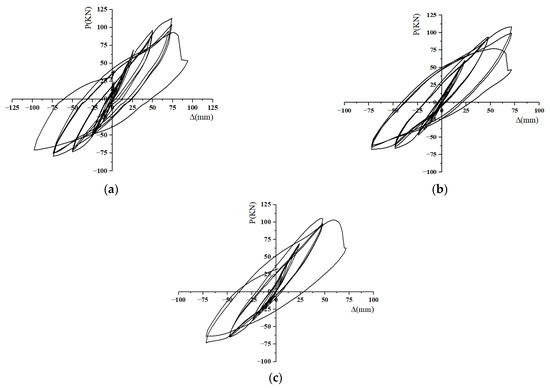 The P–Δ hysteretic curves of three specimens are given in Figure 7, where P is the load imposed onto the end of the beam and Δ is the corresponding displacement. The positive load in Figure 7 means that the bottom plate of the composite beam is in tension and the concrete slab is in compression.