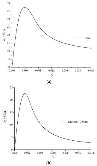 The concrete damage plasticity model provided by ABAQUS is applied to simulate the concrete where the stress–strain relationship can be selected according to whether the concrete is confined. The stress–strain constitutive model of confined concrete proposed by Han et al. [20] is used for in-filled concrete in the square steel tube, and the stress–strain relationship presented by GB50010-2010 [21] is adapted to simulate the normal concrete for the composite beam, as shown in Figure 8 (σc = stress of concrete and εc = strain of concrete). In the concrete constitution, the damage variables of concrete are defined according to the theory proposed by Du et al. [22]. Five parameters are used to describe the concrete yield function and plastic flow procedure, i.e., the dilation angle (ψ) is 30°, the eccentricity (ε) is 0.1, the ratio of initial equiaxial compressive yield stress to initial uniaxial compressive yield stress (fb0/fc0) is 1.16, the ratio of the second stress invariant on the tensile meridian (K) is 0.6667, and the viscosity parameter (μ) is 0.005.