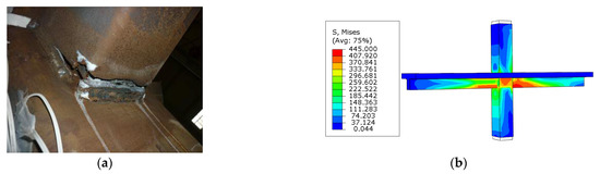 From Figure 10, it can be seen that the stress in the region adjacent to the connection between the bottom plate of the U-shaped steel beam and the tube wall has reached the ultimate strength of steel, which indicates that the fracture occurred here. The red part in Figure 10d is the most severe concrete damage area, which means that the concrete slab near the column in this area is crushed. Meanwhile, the stress in the region far away from the connection zone is much smaller than the corresponding yield strength of the material. Therefore, the numerical results are consistent with the experimental results.