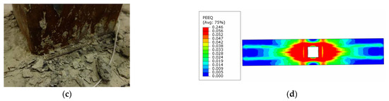 Comparison of tested and simulated failure modes of specimen C-1: (a) fracture of the bottom plate of U-shaped beam; (b) von Mises stress contour in the connection; (c) concrete crushing in the slab; (d) PEEQ contour in the concrete slab.