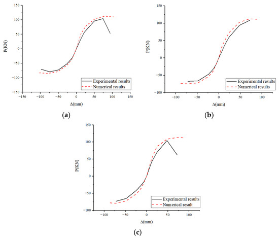 In order to verify the feasibility and accuracy of the developed finite element model in Section 4, the finite element analyses under cyclic load of the three tested specimens are conducted and the numerical results are compared to those from the experiments.