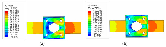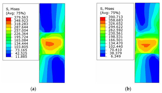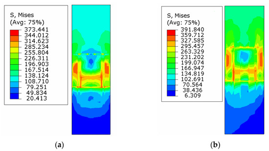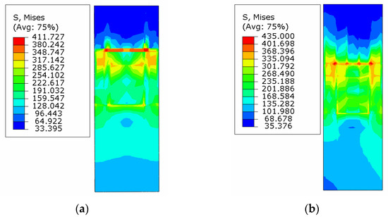 Figure 14 and Figure 15 depict the von Mises stress contours of the left and right flange of the steel tube in the connection zone at the yield state. The upper part of the left flange given in Figure 14 is in tension and the lower part is in compression. This is because the left flange is connected with the composite beam under a negative moment. The right flange given in Figure 15 is connected with the beam under a positive moment. Consequently, the upper part of the flange is in compression and the lower part is in tension.