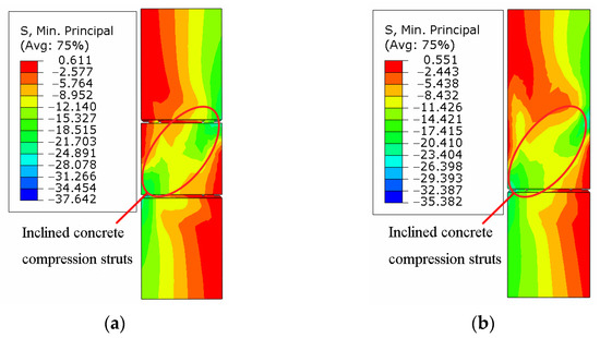 It can be seen that the inclined concrete compression strut has been formed along the diagonal line of the connection zone for each connection, and the principal compressive stress in the inclined concrete strut increases gradually from the center to the ends. Compared to the RT connection, the inclined concrete compression strut of the RS connection exhibits better behavior with a regular shape and higher stress level. This is mainly due to the fact that the upper and bottom internal diaphragm of the RS connection formed a confined space within the steel tube which gives a strong restraining effect on its internal concrete, and thus increases the main compressive stress of the concrete and develops the concrete material properties.