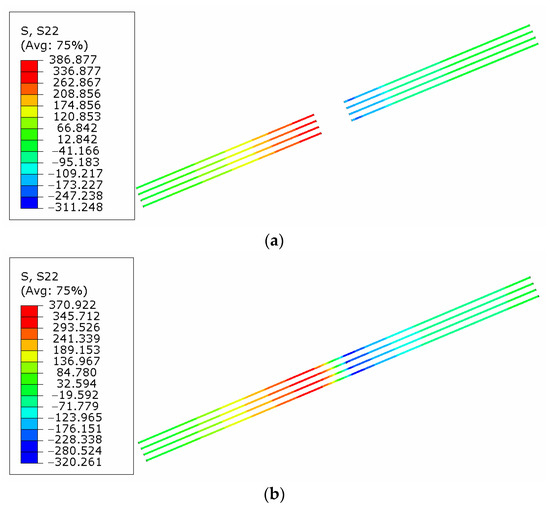 It can be seen that the maximum stress in both the continuous rebars and cutting rebars of the composite beam occurred near the tube wall, and the stress decreased as it moved away from the tube wall. For both specimens, the stress in the compressive region of the longitudinal rebars is significantly less than that in the tensile region. This indicates that the horizontal forces in the tensile slab are mainly resisted by the longitudinal rebars due to the lower concrete tensile strength, whereas the horizontal forces in the compressive slab are resisted by the longitudinal rebars and concrete together.