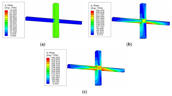 Development of von Mises stress of steel components: (a) von Mises stress contours of steel components subjected to axial load on the column; (b) von Mises stress contours of steel components at the yield state; (c) von Mises stress contours of steel components at the ultimate state.
