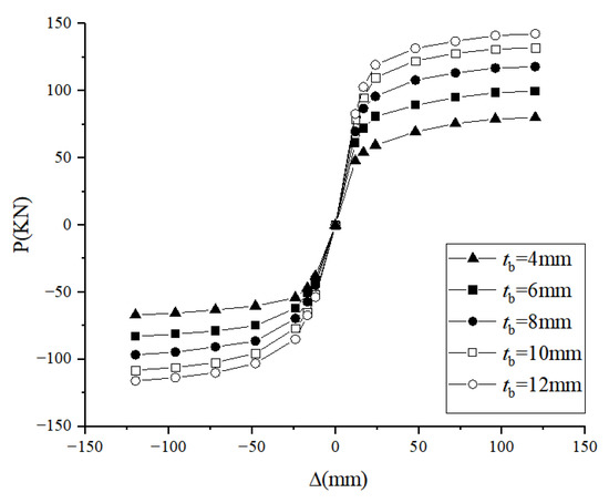 The comparison of load-displacement curves with different thicknesses of the U-shaped steel are shown in Figure 19. It can be seen that the loading capacity of the connection increases obviously with the increases in the thickness of the U-shaped steel under both positive and negative P, and that the increase of the loading capacity under positive P is bigger than that under negative P. In addition, the increased amplitude of loading capacity for the connection decreases with the increases of tb. The loading capacity increases by about 20% when tb increases from 6 mm to 8 mm, while it increases only about 10% with tb from 10 mm to 12 mm. It can be concluded that the loading capacity of the connection is substantially improved when tb is increased within a certain range.
