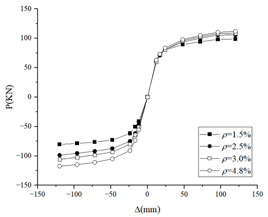 The comparisons of load-displacement curves with different ratios of the longitudinal rebars (ρ) are shown in Figure 20. It can be seen that the ratio of the longitudinal rebars has a notable effect on the loading capacity of the connection—especially under negative P. The loading capacity is increased by about 45% when ρ is increased from 1.5% to 4.8% under negative P. However, the loading capacity only increased by about 15% when ρ increased from 1.5% to 4.8% under positive P.