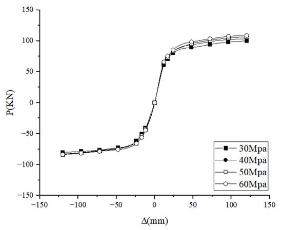 The comparisons of load-displacement curves with different strengths of concrete in the beam are shown in Figure 21. The strength of concrete in the beam has little effect on the loading capacity of the connection. The loading capacity under positive P is increased by about 10% when the concrete strength (fcu) increased from 30 MPa to 60 MPa. However, the loading capacity under negative P faintly increases.