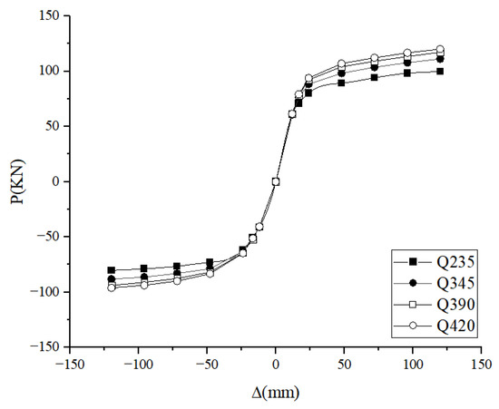 The comparisons of load-displacement curves with different strengths of the U-shaped steel are shown in Figure 22. The strength of the U-shaped steel has a definite effect on the loading capacity of the connection under both positive and negative P. The loading capacity is increased by about 20% when the steel yield strength (fy) increased from 235 Mpa to 420 Mpa.