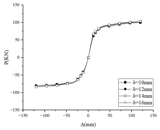 The comparisons of load-displacement curves with different thicknesses of the internal diaphragm (h) are shown in Figure 23. It can be seen that the thickness of the internal diaphragm has a slight influence on the loading capacity of the connection under both positive and negative P. The loading capacity hardly increases with an increase in h. This is due to all of the specimens meeting the seismic design principle of strong columns and weak beams, strong junctions and weak components. Therefore, the loading capacity of the connection is mainly dependent on that of the beam ends for the specimens that failed at the beam end.