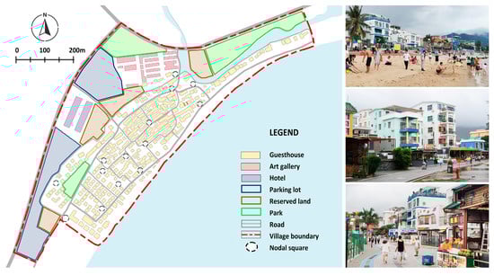 Jiaochangwei Village is located 50 km east of Shenzhen, Guangdong Province, and has a resident population of 360. The economic base of this village was weak, as fishing was the main source of income for many generations. Although the village received several small factories that were relocated from the inner city, the majority of its young people moved to the city in pursuit of work opportunities, leading to a severe hollowing out of the village. The village has a long beach and preserves a rich Hakka culture that has the potential to attract tourists. In addition, the surrounding area of this village, the Dapeng Peninsula, has a wealth of tourism resources that form the basis for joint development [3,40]. For example, the 600-year-old walled military settlement Dapeng Fortress is a national historical and cultural site. Dongshan Temple is a Buddhist temple with a long history and many followers.
