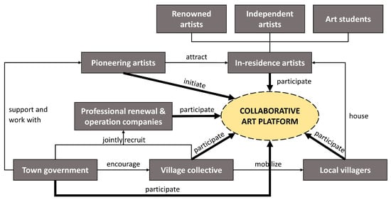According to the information gathered from interviews, the contributions of major stakeholders and structures of collaborative governance approaches in three cases are explained with illustrative diagrams (for example Figure 2). Each dark gray box in these diagrams represents a particular stakeholder. The directional linkages between boxes show how various stakeholders are connected. The thick arrow lines highlight members contributing to collaborative governance platforms. Using information collected from field investigation, we also mapped the outcomes of spatial reconfiguration in these villages, together with photographs of their important locations.