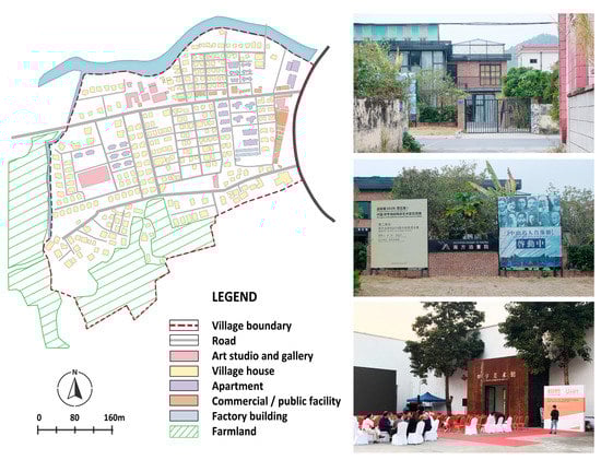 In the initial phase, the government announced a rent waiver policy to invite in-residence artists. The village collective also offered the free use of a considerable part of the unsold area of Cuiyi Garden (about 4400 square meters). With the help of his networks, the leading artist succeeded in attracting a dozen renowned artists after converting the space into art galleries and studios using raised funds. These artists have greatly enhanced the reputation of the village by hosting major art exhibitions and events. After seeing the success, more artists and art students moved to the village for training and continuing their professional careers. The village was revitalized under the influence of the artist group. In the next phase, the village collective continued to provide the artist group with other derelict properties (about 6200 square meters) free of charge, including a water plant, an elementary school, and a gathering hall. These structures were remodeled into galleries, studios, a reception center for artists, and an arts education center. In the third phase, the town government and the village collective tried to mobilize individual villagers to participate in spatial reconfiguration. Some of the private residences were changed into art facilities (Figure 7). However, because the transformation was conducted on an individual basis, the overall physical environment was far from satisfactory to attract more tourists. In particular, it was difficult to find sufficient amenities such as stores, inns, restaurants, and entertainment areas in the village.