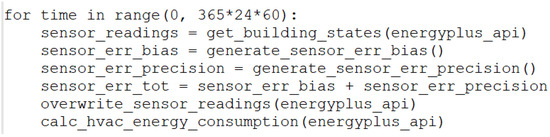 - A Python script was developed to generate 3600 simulation input data files (IDF files). Each IDF file was associated with a Python class of sensor errors through Python EMS. During the simulation, at each time step, a new sensor error (including bias and precision) was injected into the ideal sensor readings from EnergyPlus;