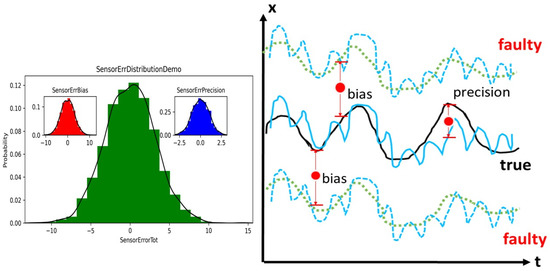 For a sensor, an ideal reading (or true reading) exists at a given time step, as shown by the black line in Figure 4. The bias error is the system deviation from the ideal readings, as shown by the green dotted lines in Figure 4. The precision error is the random deviation or noise from the average sensor readings, as shown by the blue dashed lines in Figure 4.