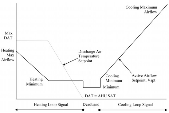 Control logic for VAV box from ASHRAE Guideline 36 [24,26].