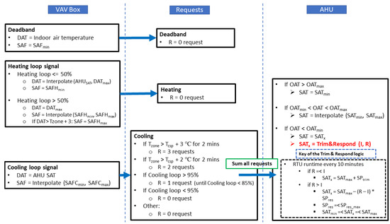 The term “request” refers to a request to reset a static pressure or temperature set point generated by downstream zones or AHUs. These requests are sent upstream to the AHU or plant that supplies the zone or area that generated the request. For more details of Trim & Respond logic, please refer to the documents of [24,26].