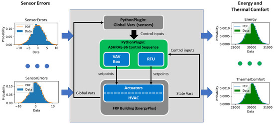 The sensor errors were sampled using a normal distribution for each time step. The sensor readings from EnergyPlus used the sensor errors to form the faulty sensor readings. The faulty sensor readings were used as inputs to control sequences to calculate new set points. These new set points were used to control the performance of buildings. Ultimately, the simulated energy consumption and thermal comfort were different from the results obtained using the ideal sensor readings.