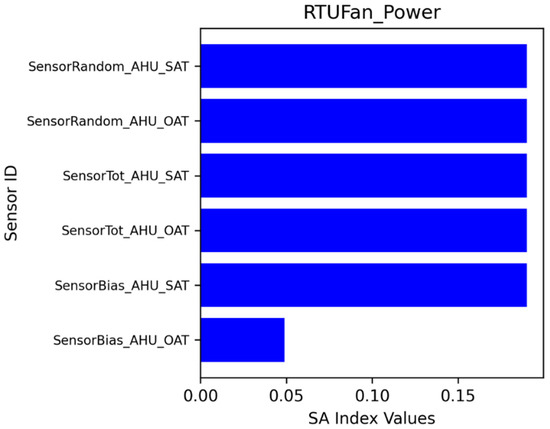 Figure 18 illustrates the sensitivity index for fan power demands. The sensor impacts are similar to the cooling power. Figure 19 illustrates the sensitivity index for main heating coil heating rates. The SAT and OAT sensors are the most dominant sensors.