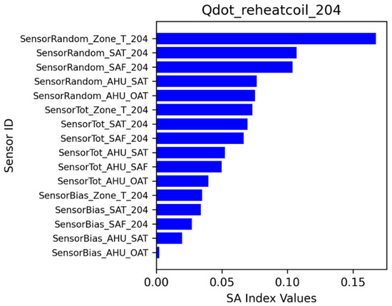 At the zone level, four energy consumption variables (zone temperature, zone sensible heating, zone sensible cooling, and reheat coil energy consumption) and one thermal comfort variable (zone-predicted percentage of dissatisfied occupants [PPD]) were selected. Figure 20 shows the ranking of the sensitivity index for zone air temperature. Overall, the system- and zone-level sensors affected the zone temperature. The sensor with the highest sensitivity index was the zone air temperature sensor with random error. The random errors were the most influential, followed by total errors and then bias errors. Figure 21 shows the ranking of the sensitivity index for zone sensible heating. The zone air temperature sensor with random error had the highest sensitivity index. Figure 22 shows the zone sensible cooling impacts from the sensors. Figure 23 shows the impacts on reheat coil energy. Figure 24 shows the sensitive index ranking for zone thermal comfort (PPD). Across zone 204 outputs, the random errors consistently had stronger impacts.