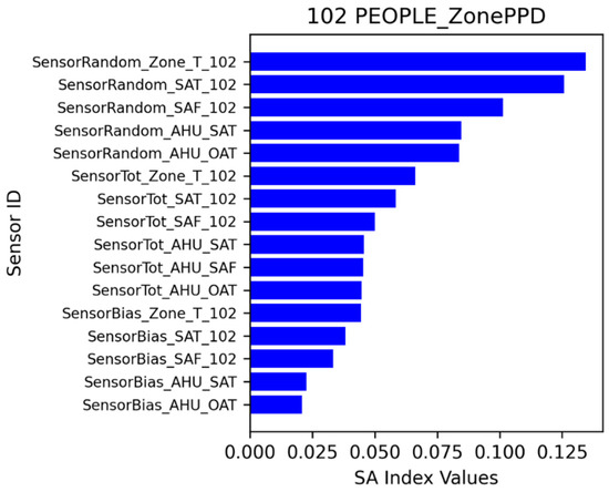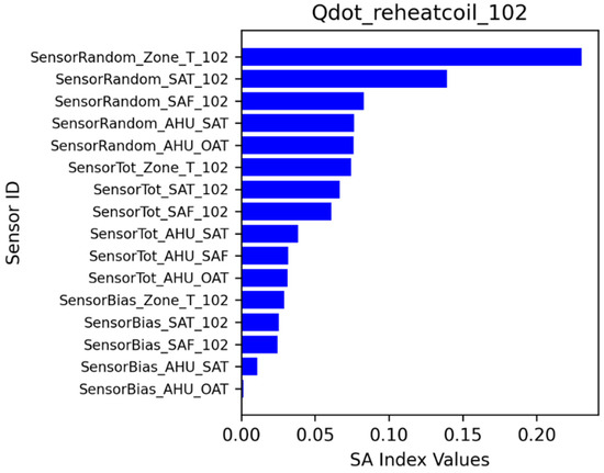 Sensitivity analysis for zone 102 was performed similarly to that of zone 204. The impacts of sensor errors on four energy consumption variables (zone temperature, zone sensible heating, zone sensible cooling, and reheat coil energy consumption) and one thermal comfort variable (zone PPD) were demonstrated. Figure 25 shows the ranking of the sensitivity index for zone 102 air temperature. The system-level sensors and zone-level sensors affected the zone temperature. The zone air temperature sensor with random error had the highest sensitivity index. Figure 26 shows the ranking of the sensitivity index for zone sensible heating. The zone air temperature sensor with random error had the highest sensitivity index. Figure 27 shows the zone sensible cooling impacts from the sensors. Figure 28 shows the impacts on reheat coil energy. Figure 29 shows the sensitivity index ranking for zone thermal comfort (PPD). Across zone 102 output variables, random errors consistently had stronger impacts.