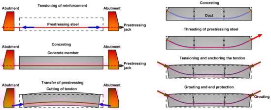 Two main groups of prestressed systems are known—pre-tensioning and post-tensioning (see Figure 1). First, pre-tensioning is a technology based on the tensioning of prestressing steel (e.g., strands, and wires) prior to casting of the concrete and usually is carried out in a factory environment. Prestressing steel is stressed between abutments. In the case of this technology, the prestressing is transferred into to member through the bond between prestressing steel and concrete. The second prestressing technology is called post-tensioning, and it is based on the tensioning of prestressing steel (tendons consisting of numerous strands) after the casting of the concrete member. This technology is usually carried out on-site and offers significant flexibility in terms of a wide range of structures and possible adjustment of tendon profiles (layout). In this case, the prestressing is transferred in the anchorages. Moreover, if the tendon is grouted with cement grout, the prestressing is also transferred via the bond. Post-tensioning can be also applied by internal tendons (part of the cross-section) or by external tendons (connected with the structure only through deviators) [2,4,5,6]. A comparison of both prestressing systems can be seen in Figure 2.