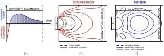 We distinguish three critical stress regions—bearing stresses (compressive stresses), spalling stresses, and bursting stresses (tensile stresses). Bearing stresses are located immediately under the anchorage and are the result of applied external loads. Spalling stresses can be found on or near the end of the member, parallel to the end face, and away from the point of loading. Finally, bursting stresses are located along the axis of loading, normal to the axis, and away from the point of loading [10]. The local zone is in the immediate vicinity of anchorages, while the general zone is the area where tensile stresses develop due to the spreading of tensile forces. The general zone’s length usually equals 1.0 to 1.5 times transverse dimensions [11]. According to [12], the anchorage zone can be studied using the following approaches: