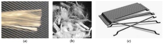 Currently, various types of fiber reinforcement are used for the production of fiber-reinforced concrete. The main classification is according to material—non-metallic and metallic fiber. Non-metallic fiber include glass fiber, polypropylene, basalt fiber, and so on (Figure 4a,b). The application of non-metallic fiber is mostly used in the case of less mechanically stressed structures, e.g., base plates. The use of this fiber is mostly for structures that are not designed to be extremely mechanically loaded [16,17,18]. The disadvantage of non-metallic fiber is their low ductility and weak mechanical anchoring in the cement matrix.