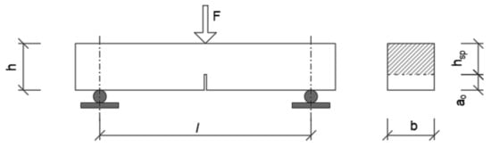 To determine the fracture energy parameters of fiber concrete, it is necessary to perform a 3-point bending test. From these tests, we can assume the elastic behavior of fiber concrete until reaching the crack initiation limit. After the formation of a crack, the ultimate stress occurs in the outer fiber. The tension determined in this way is called the bending tensile strength , and its value is determined according to Equation (2):