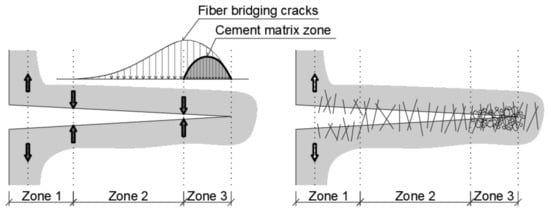 If a crack forms in the cement composite, the fiber serves to slow down the unstable crack propagation (see Figure 7). Tensile stress is transferred across the crack by various mechanisms [28]. Three distinct zones can be identified in fiber-reinforced cement composite:
