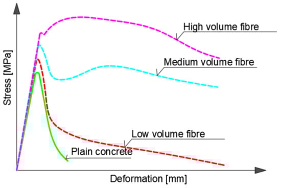 The input values of materials such as fiber-reinforced concrete are not easy to determine. The reason is that it is not possible to predict the dispersion of fibers in the cement composite. The random dispersion of fiber greatly affects the mechanical properties of fiber concrete; it increases tensile strength and toughness. As already mentioned, this behavior is influenced by the type of fiber and the volume of added fiber [25,26,27,28]. Figure 8 shows the dependence of stress and deformation on the volume of added fiber. If the volume of fiber is sufficient, the composite hardens, and conversely, if the volume of fiber is insufficient, the composite softens.