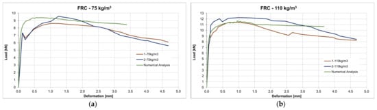 Consequently, the performed study suggests that the application of fiber-reinforced concrete in the case of anchorage zones of various structures can be a possibility to increase the load-carrying capacity of such structures. However, it seems that for a notable increase, a higher volume of fiber is needed. In practice, it can be effective to cast the whole structure from standard reinforced concrete in advance and subsequently cast fiber-reinforced concrete block in the anchorage zone. This approach can be applied, for example, in the case of prestressed concrete or geotechnical structures. Based on the performed analysis, the recommendation includes performing a three-point bending test, which is essential for the proper determination of fiber-reinforced concrete behavior. Subsequently, obtained data should be used for the design of the anchorage zone. Importantly, it is suitable to focus on the analysis of fiber-reinforced concrete performance with higher volumes of added fibers. Nevertheless, given that our findings are based on a limited number of performed tests and simulations, the results from such an experimental program supported with numerical analysis should, therefore, be treated with considerable caution.