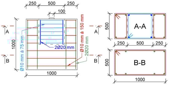 For the numerical study, a block specimen with a length and width of 1000 mm and depth of 500 mm was designed. Three types of specimens were analyzed. First, the anchorage zone was cast from standard reinforced concrete (grade C30/37). Second and third, the anchorage zone was created by adding fiber-reinforced concrete with two different fiber volumes. In the case of the casting of the specimen, the cubic gap was created in the anchorage area with a size of 500 mm. Later, fiber-reinforced concrete block with two different amounts of steel fibers was cast in this gap. In the analysis, fiber-reinforced concrete was considered with the following parameters: the volume of fiber of 75 kg/m3; and the volume of fiber of 110 kg/m3. The conventional reinforcement (grade B500B) of the specimen consisted of longitudinal bars with a diameter of 20 mm and two-legged stirrups with a diameter of 10 mm and spacing of 150 mm. In the anchorage zone, the spacing of two-legged stirrups was 75 mm. The conventional reinforcement layout was the same for both types of specimens (with/without fiber-reinforced concrete). The specimen is depicted in Figure 11.