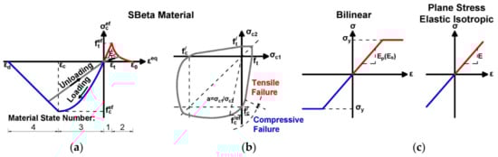 The applied SBeta constitutive model of concrete includes twenty material parameters. The parameters used were assigned according to ATENA 2D software guidelines for finite element analysis. The formulation of constitutive relations was considered in the plane stress state. The stress–strain curves of individual modelled materials can be seen in Figure 13. A more detailed description of the used SBeta constitutive model is presented in [29].