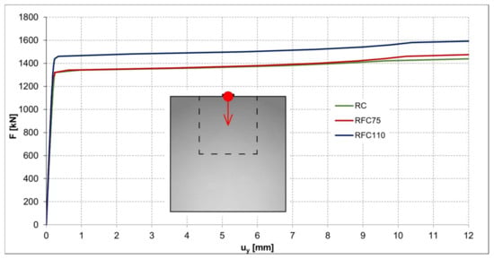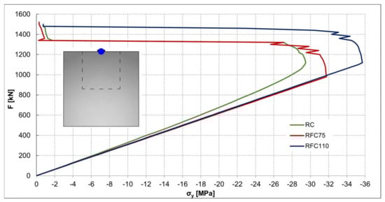Numerical analysis was performed to compare the influence of adding Dramix 3D 55/30 fiber into the anchorage zone. In Figure 14, it can be seen that the relationship between the applied force and displacement is similar for the anchorage zone from standard reinforced concrete and fiber-reinforced concrete with a lower volume of fiber (75 kg/m3). In this case, the effect of the presence of fiber is negligible. However, in the case of a higher volume of fiber (110 kg/m3), the load-carrying capacity is higher by almost 10%. Red (deformation) and blue (stresses) marks in Figure 14, Figure 15 and Figure 16 represent monitoring points.