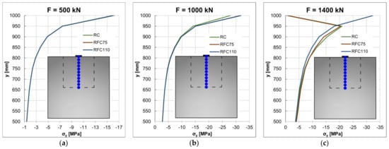 Stress σy distribution along the height of the anchorage block: (a) F = 500 kN; (b) F = 1000 kN; (c) F = 1400 kN.